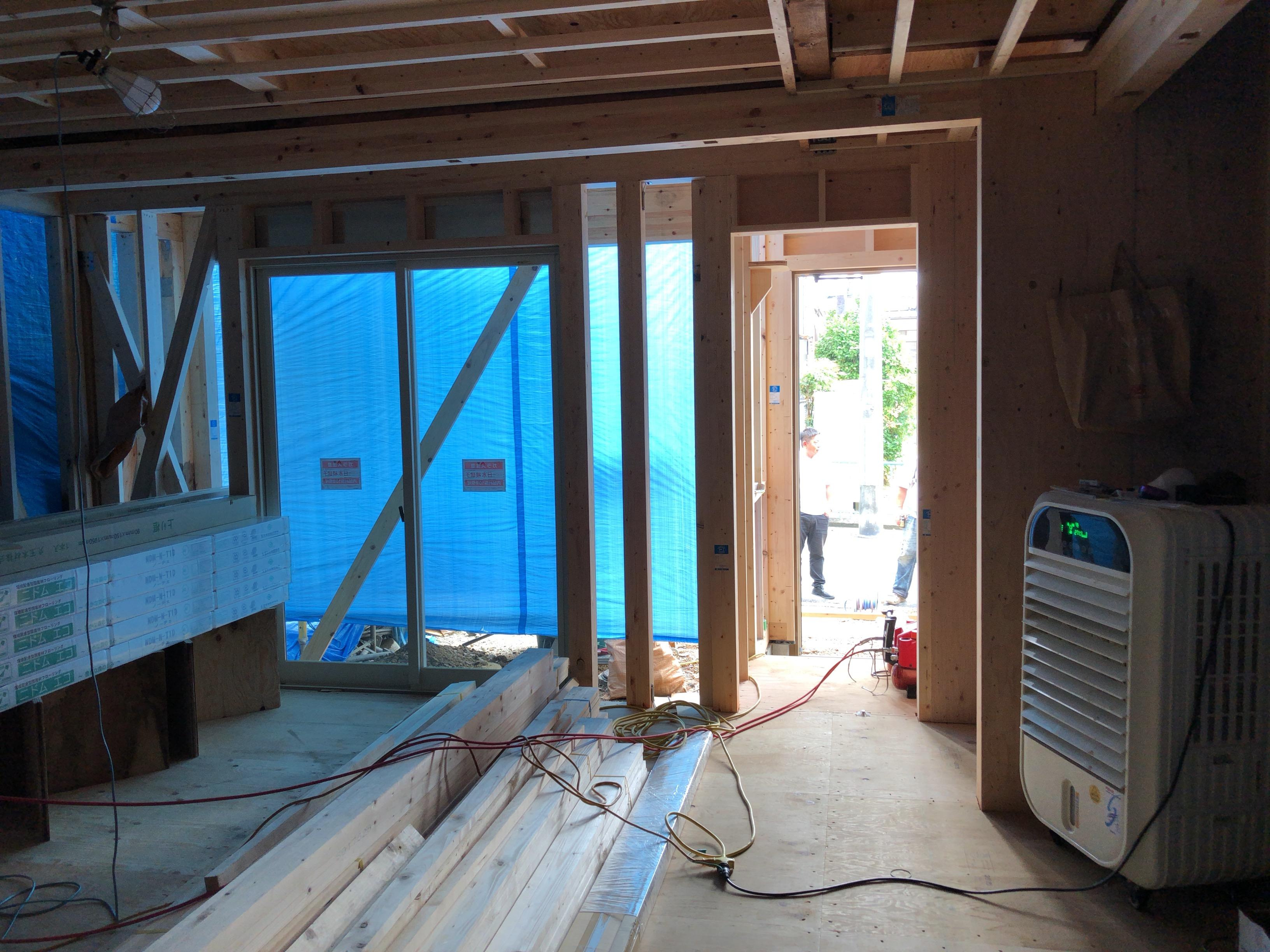 きのうは仮の筋かいも少しずつ外れ,柱も床の下地もつくられていました。